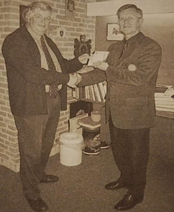 Burgemeester Verkerk (rechts) ontving het fotoarchief van zijn gemeente Noordenveld, 2000